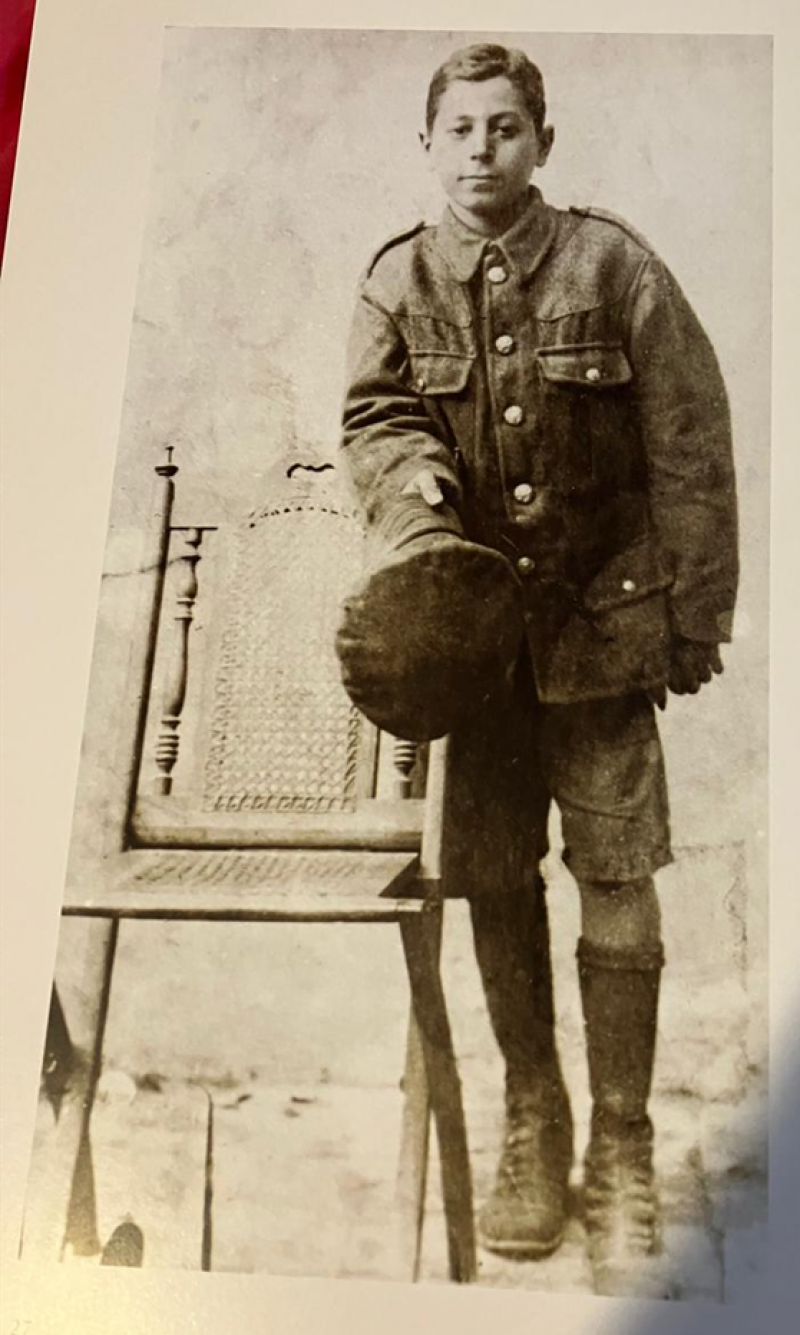 وفي الصورة أعلاه التي اخذت عام 1916 وهو في الثانية عشر، نرى سعادة بلباس عسكري، ذلك ان المال لم يكن متوفراً له ولإخوته لشراء ثيابهم، فكان الجنود البريطانيون يعطونه ما لديهم لقاء عمله.